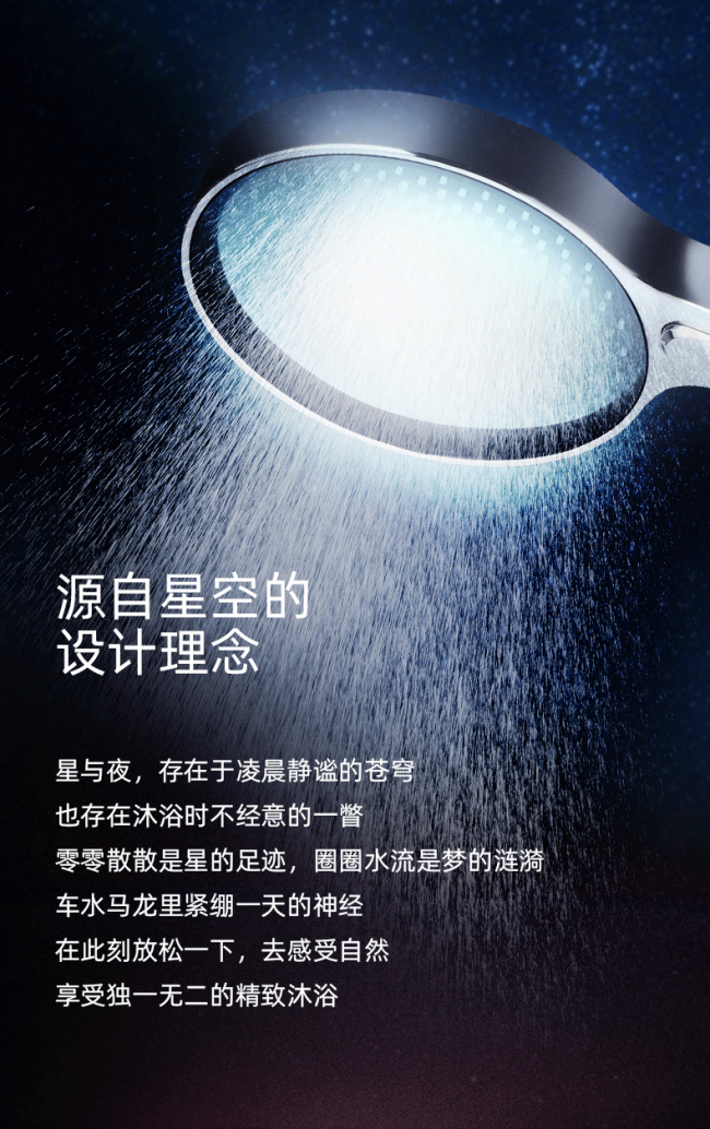 西屋星夜花洒的设计理念源自星空,希望能给沐浴的人们一种静谧的感受,让一天的压力都随着水流淌走。