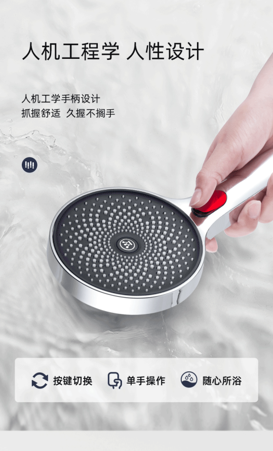 西屋星夜花洒共有三种沐浴模式:脉冲模式、雨淋模式以及混合模式,操作按键即可切换。脉冲模式下水流的冲击力较大,可以在用完沐浴露后使用,可以很快冲干净身上的泡沫。雨淋模式顾名思义,就像细雨淋在身上的感觉,水量足但力道轻柔,全身都可以被水流包裹,轻松惬意。混合模式水量最多,有点像顶喷的效果,三种模式各有特色,满足你的不同需求。
